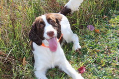 Smokey is the “ladies man” of our clan. He is the Springer version of “Casanova.” He likes to impress the ladies with his grooming skills. When Smokey is around all of our girls have the cleanest ears in town! If this isn't most impressive, then he will “wow” them with his speed. Smokey was born to not just run, but to run fast. If we could get him to slow down, we think he just might have wheels for feet!