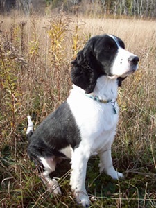 We would like you to meet our girl “Autumn”. She is our beautiful black and white female springer. She is feisty, full of energy, fun loving and eager to please. She is at her best when working the field for birds. Autumn has been the mom of three previous litters. She is an amazing girl who loves to flush birds, chase balls and play with her pups. She always has oodles of kisses to share and is always in the mood to snuggle on her favorite arm chair.